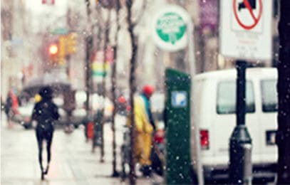 de lejos: nombres de tiendas y calles, número de autobús, coches.